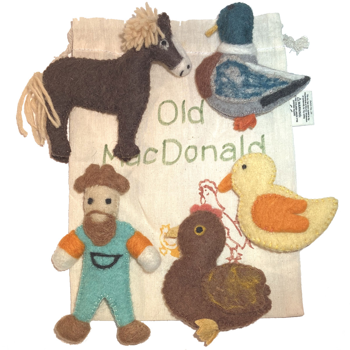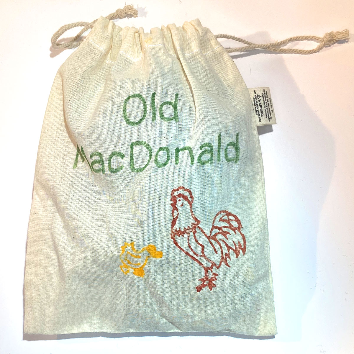 There are five different finger puppets: Old Macdonald, horse, duck, duckling and hen, all safely contained in an undyed cotton bag.